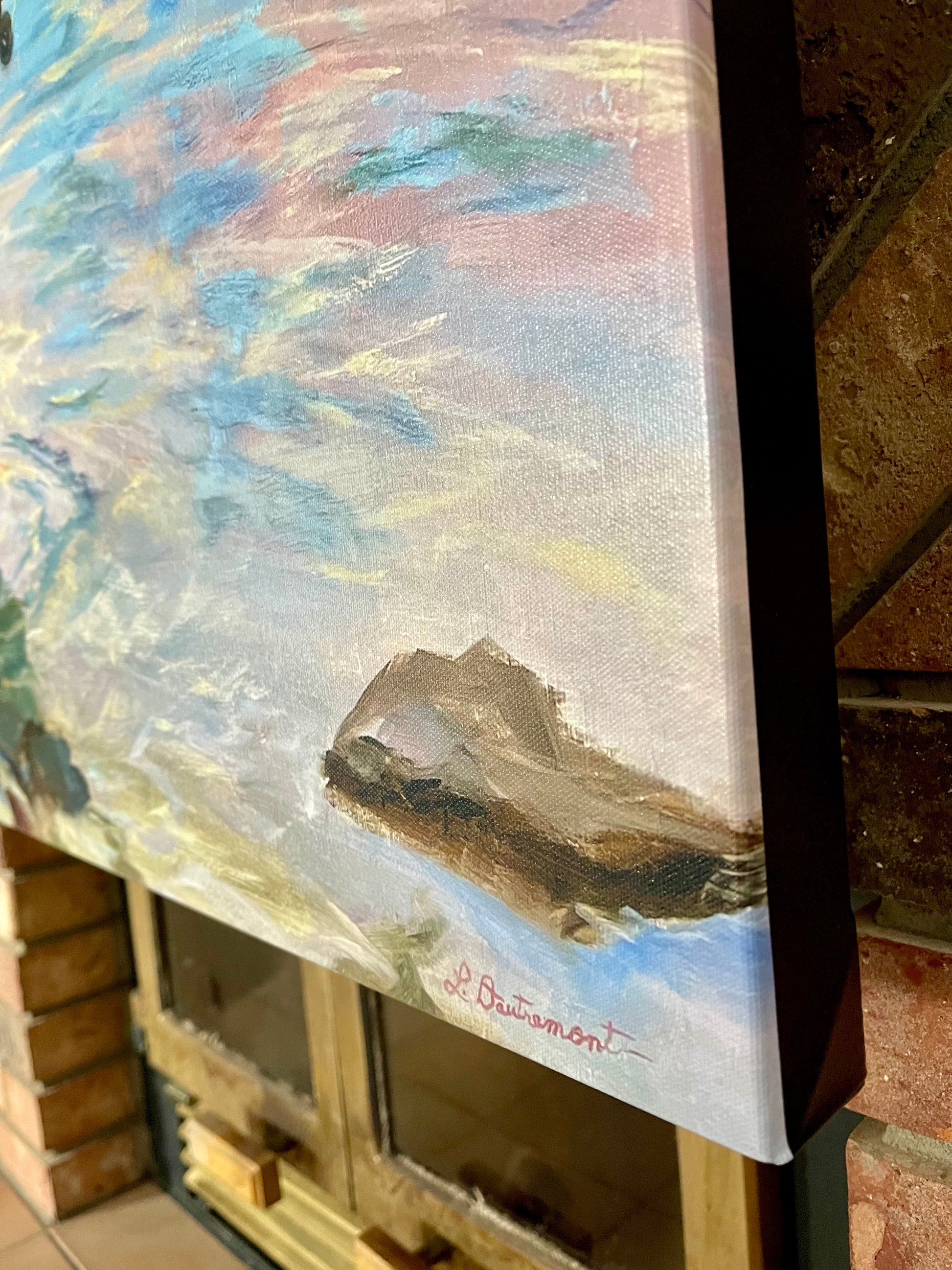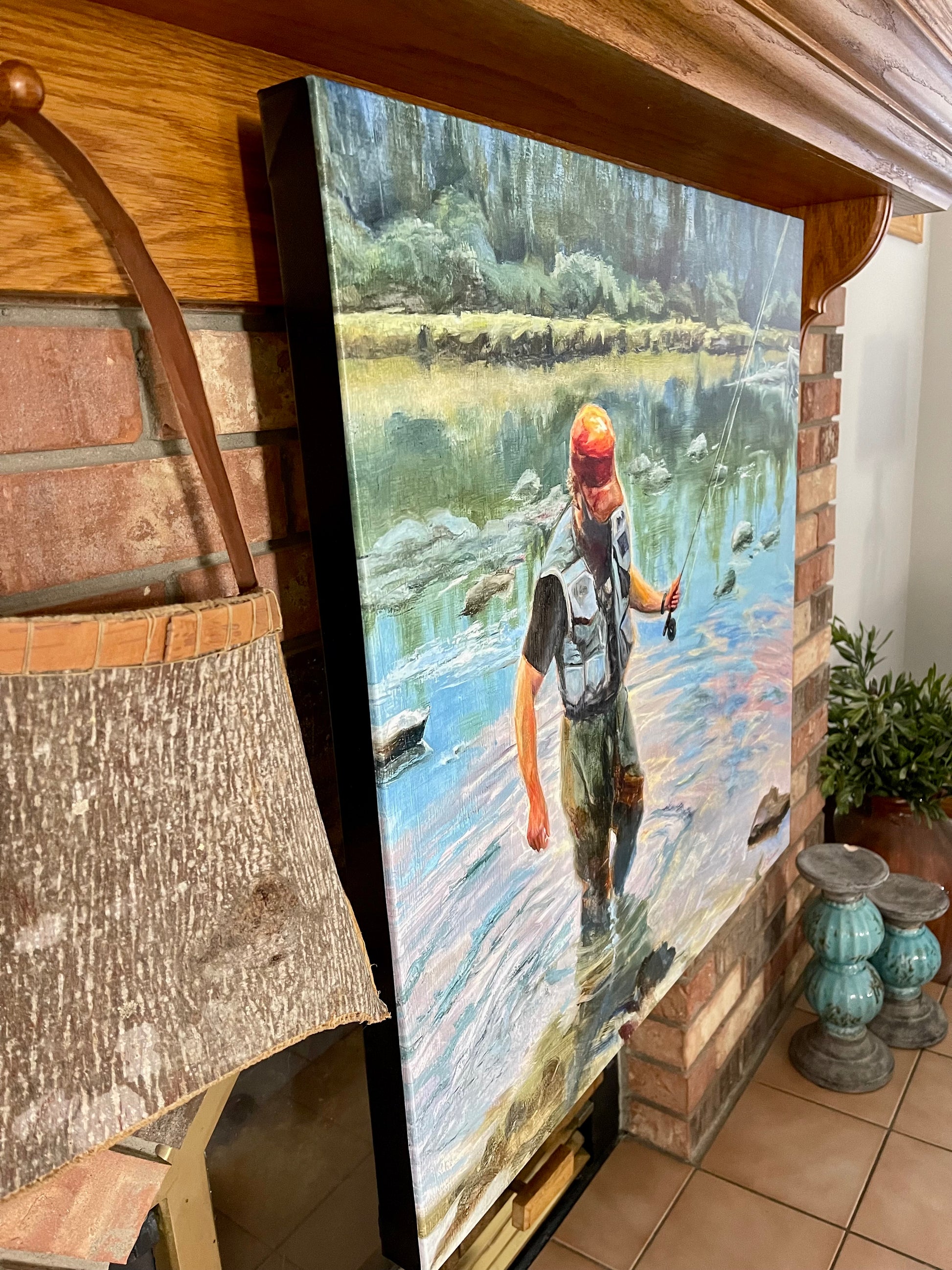 “Catching the Light” was an oil painting I did of one of our sons who loves the outdoors and has enjoyed time fly fishing in the rivers of our Canadian Rocky Mountains. I’m offering canvas prints stretched on 3/4” deep wooden bars. If you would prefer the more expensive 1-1/2” deep gallery stretcher bars please contact me. The side edges of the print will be black unless you contact me after purchasing to request white or a neutral mid tone. You may hang this painting unframed or take it to a framer of your choice. I’m offering 4 sizes but if there’s another square size you prefer please contact me prior to ordering and I’ll add it to this product page. Maximum size option is 28” x 28”. For perspective in size, the canvas print pictured hanging in front of my fireplace is 28”x28”.
