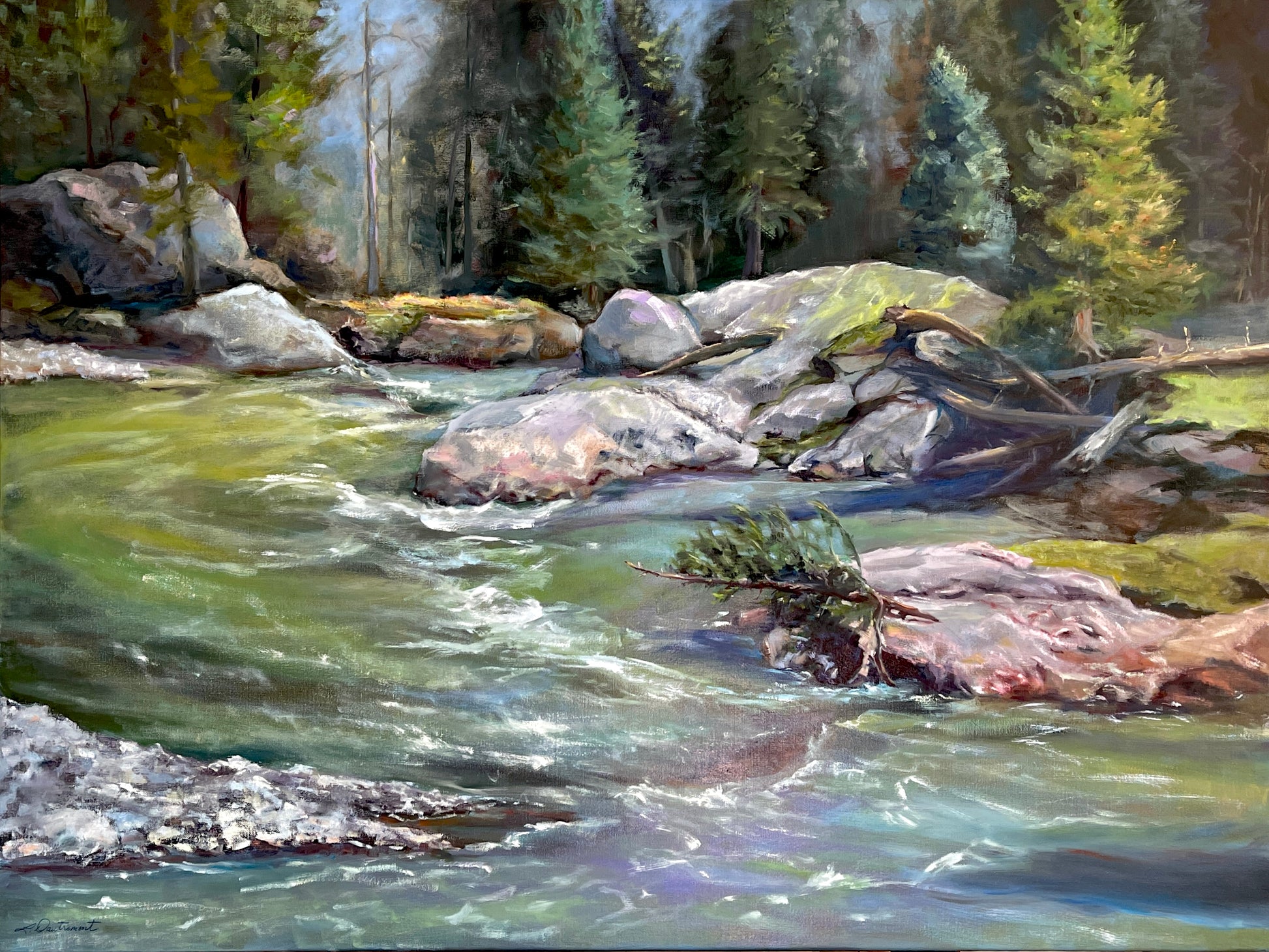 We visited Cooke City, Montana during the 100 year flood event in June of 2022. This painting arose from that visit along the shore of Clark’s Fork. We had to evacuate 3 hours after I painted a small study for this larger painting. It was a time many will never forget!