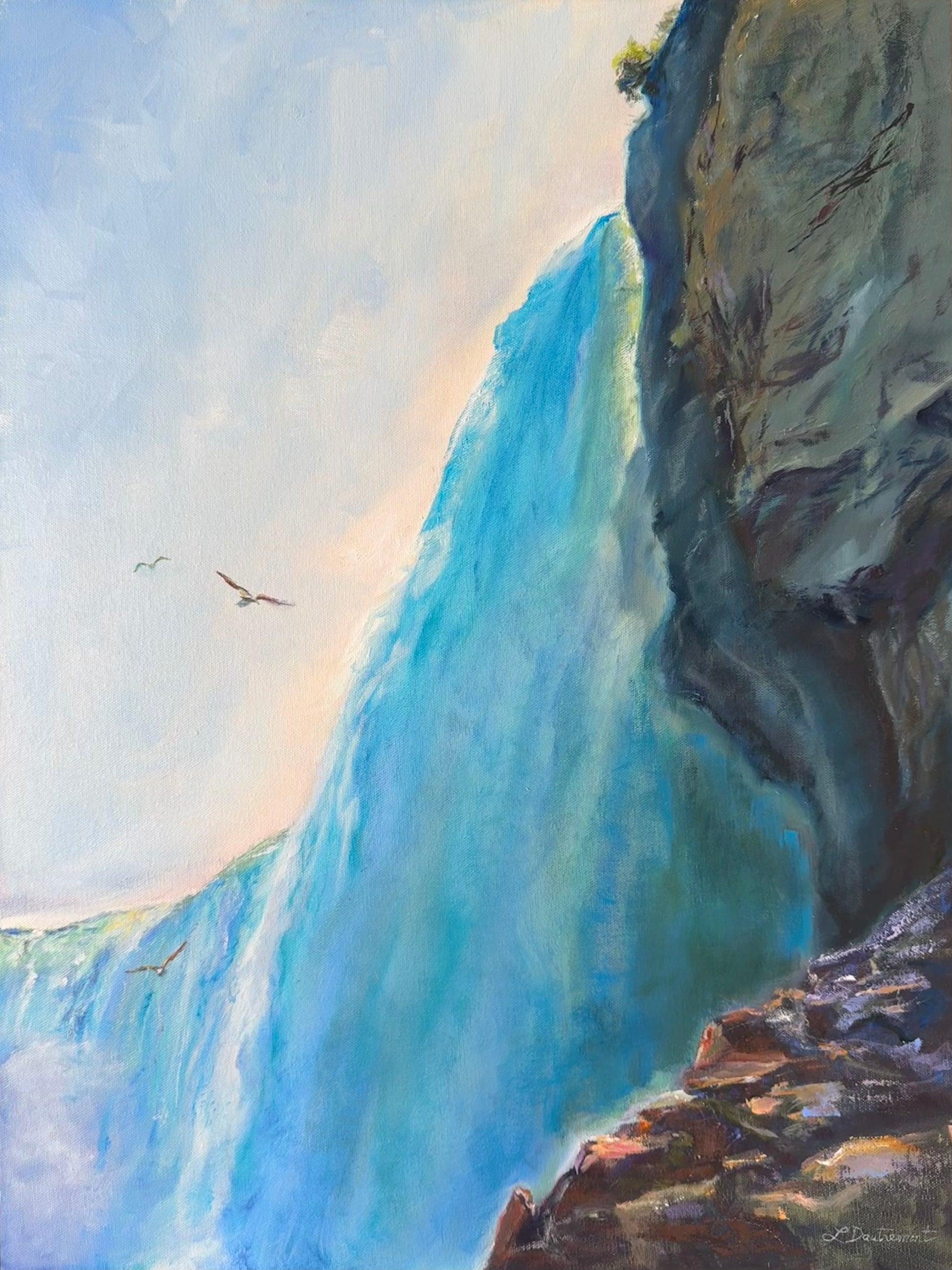 This oil painting was birthed from a visit to Niagara Falls over a decade ago. There was a path midway up along the cliff that lead to the side edge of the falls. The roar, the mist, and the curtain of the falls caused one to feel completely enveloped by the power and majesty of the water falling over the edge of the cliff. It was an unforgettable feeling!