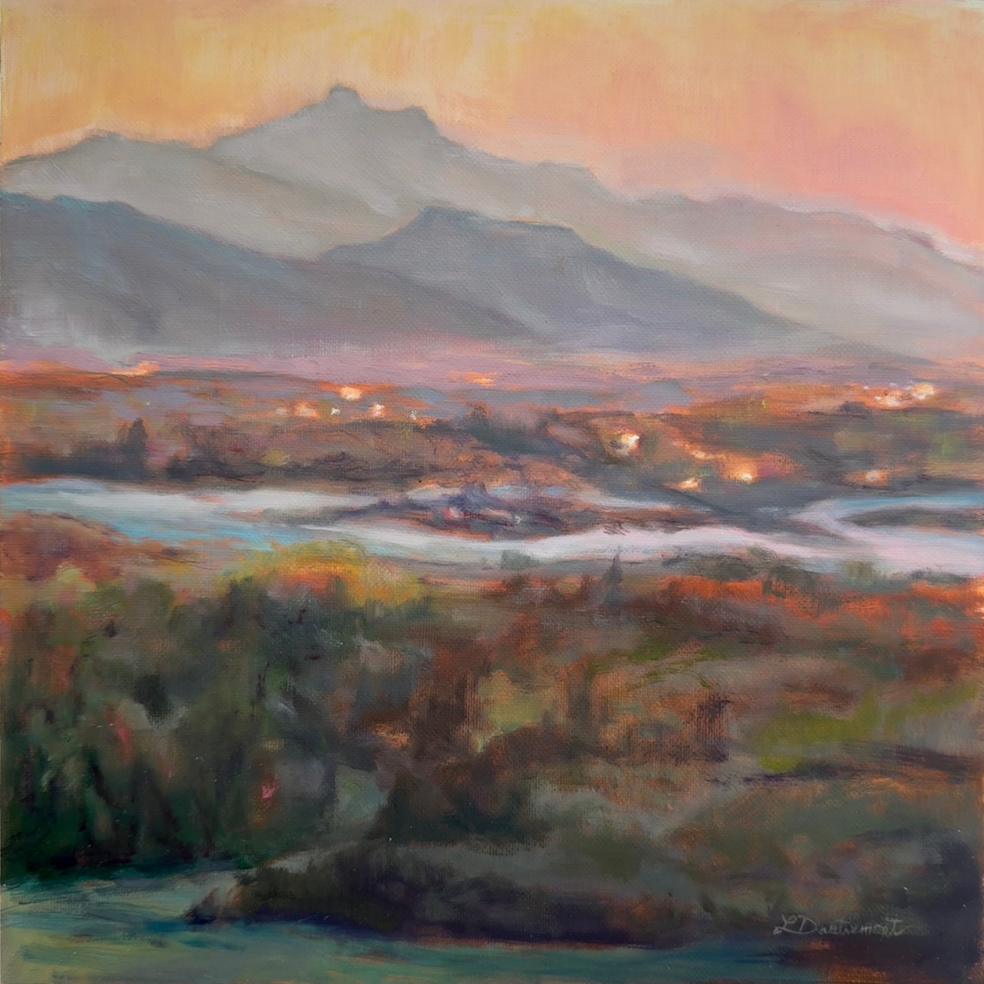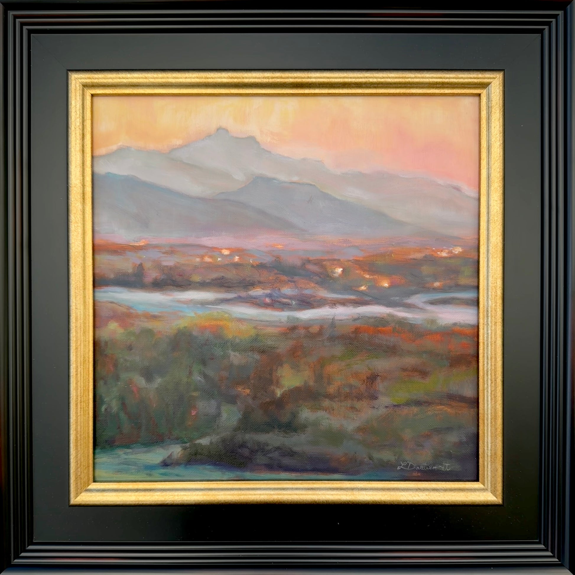 Oil painting, 12” x 12” on linen covered panel plus frame.