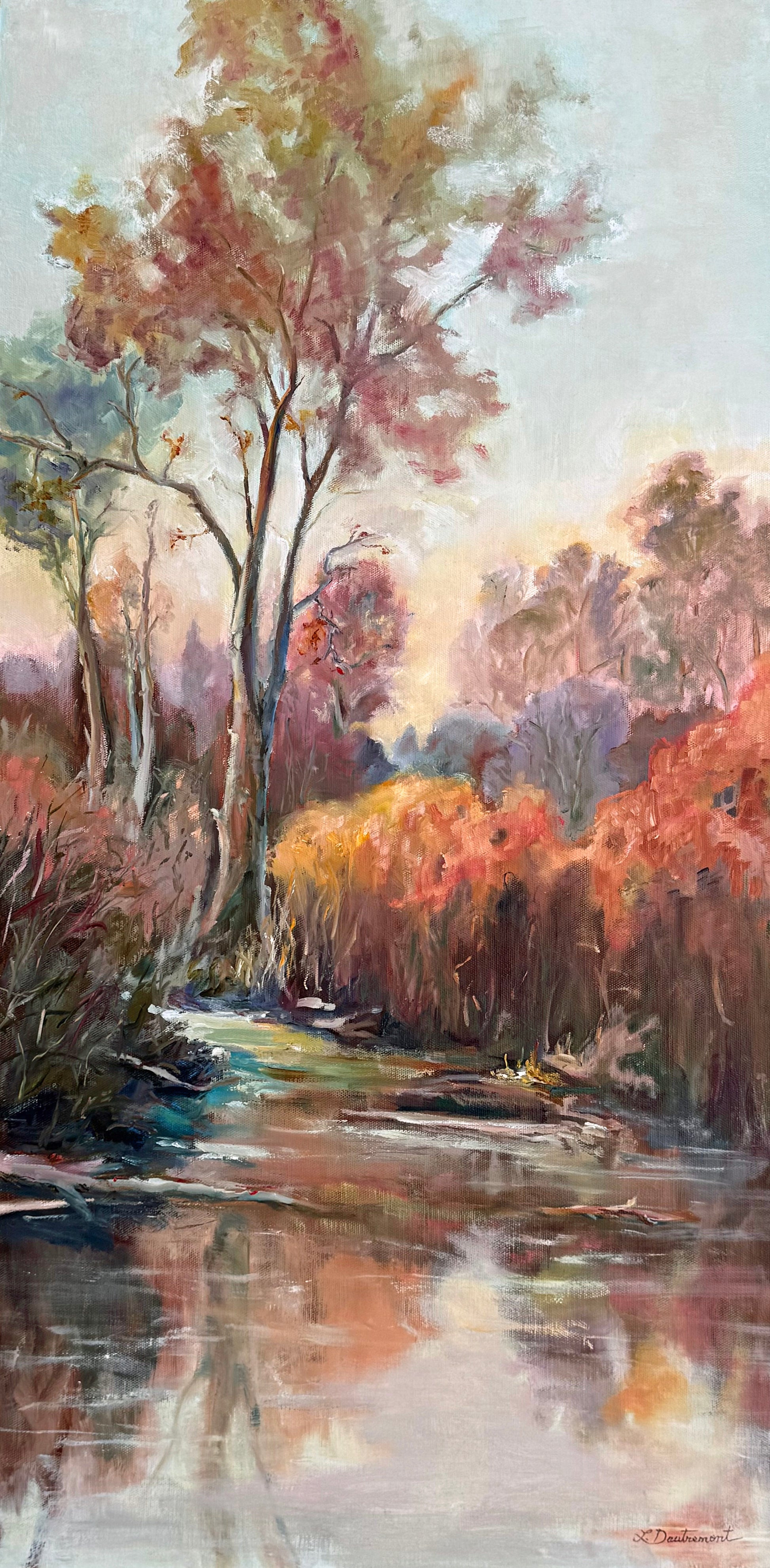 This serene autumn scene in rich warm colours is painted in oil on canvas mounted onto a 1-1/2” depth gallery cradled board. 36” x 18”, unframed with hanging wire attached.